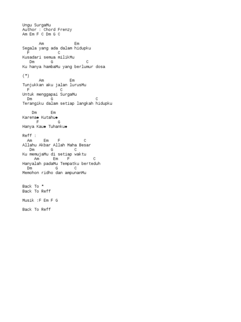 81,264 views, added to favorites 1,054 times. intro am em f c dm g c c am segala yang ada em dalam hidupku f c ku sadari semua milikmu dm g ku hanya hambamu yang c berlumur dosa am tunjukkan aku. C fm c em ku. Chord gitar dan lirik lagu religi 'surgamu' ungu: Sampai tahun 2015 mereka telah menghasilkan 7 album studio, 5 album.